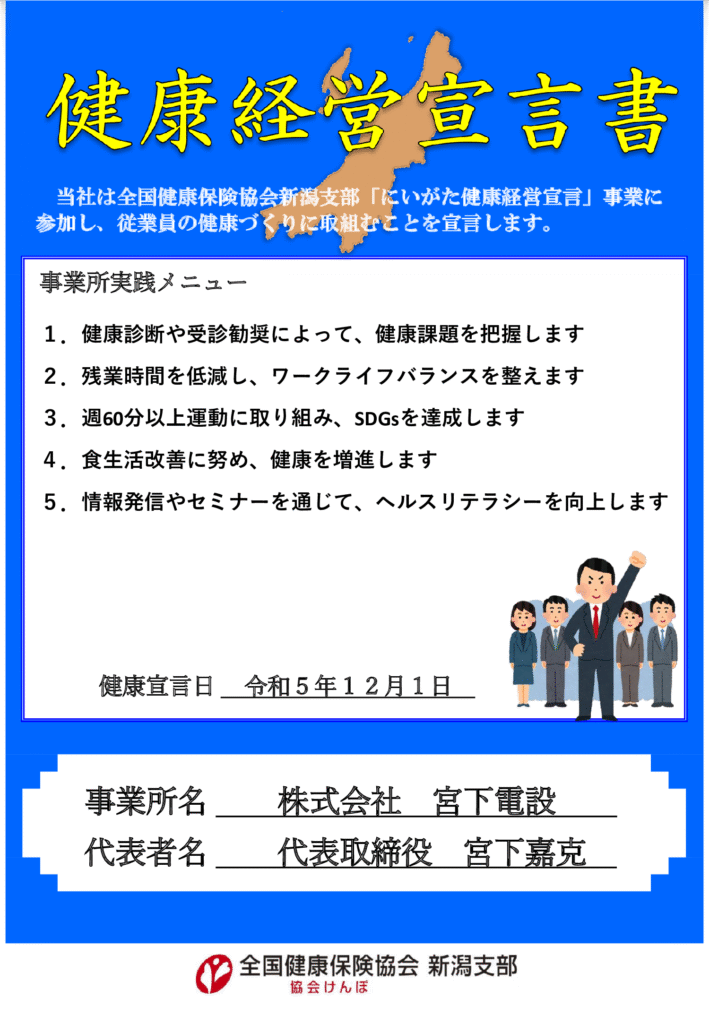 2023年12月に健康経営宣言を行い、5つの実践メニューに取り組んでいます。